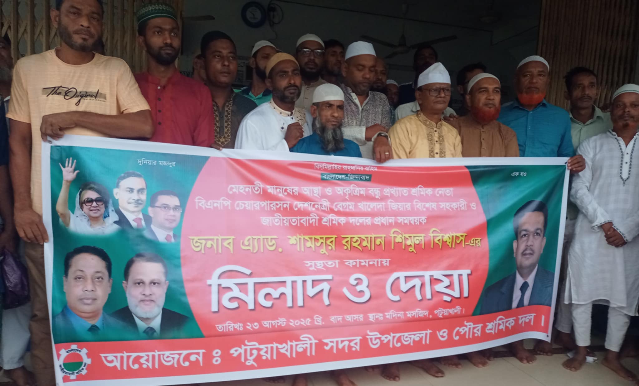 শনিবার (২৩ আগস্ট) বাদ আসর মদীনা জামে মসজিদে পটুয়াখালী সদর উপজেলা ও পৌর শাখা শ্রমিক দলের আয়োজনে দোয়া- মিলাদ- এ অন্যান্যের মধ্যে উপস্থিত ছিলেন জেলা শ্রমিক দলের সিনিয়র যুগ্ম সাধারণ সম্পাদক একেএম কলেজের সাবেক জিএস আব্দুর রাজ্জাক মোল্লা, সহ-সভাপতি মোঃ বাবুল ইসলাম, সাংগঠনিক সম্পাদক মোঃ খলিল সিকদার, দপ্তর সম্পাদক মোঃ মিজানুর রহমান টিটু, সদস্য আঃ রব, সদর উপজেলা শ্রমিক দলের নেতা মোঃ হাবিবুর রহমান হাবিব, পৌর শ্রমিক দলের নেতা মোঃ দুলাল, সান্টু মৃধা, মোঃ আবুল সরদার, মোঃ মোশাররফ হোসেন ও ঘাট শ্রমিক দলের নেতা মোঃ বশির প্রমুখ।