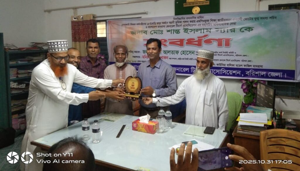 মোঃ ফরিদ উদ্দিন: বেসরকারি শিক্ষক কর্মচারীদের ১৫ পার্সেন্ট বাড়িভাড়া অর্জনে অগ্রণী ভূমিকা পালন করায় এমপিওভুক্ত শিক্ষা জাতীয়করণ প্রত্যাশী জোটের যুগ্ম সদস্য সচিব ও বাংলাদেশ মাদ্রাসা জেনারেল টিচার্স অ্যাসোসিয়েশনের মহাসচিব শান্ত ইসলামকে বাংলাদেশ মাদ্রাসা জেনারেল টিচার্স এসোসিয়েশন, বরিশাল জেলা শাখার আয়োজনে এক সংবর্ধনা প্রদান করা হয়েছে।