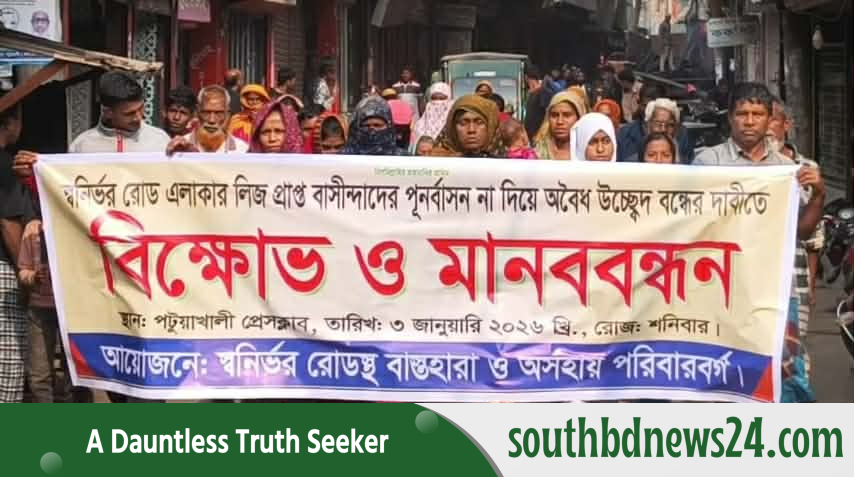 পটুয়াখালীর স্বনির্ভর রোড এলাকায় সরকারি জমি লিজ নিয়ে দীর্ঘদিন বসবাসকারী বাস্তুহারাদের পুনর্বাসন ছাড়া উচ্ছেদের হুমকির প্রতিবাদে মানববন্ধন ও বিক্ষোভ মিছিল